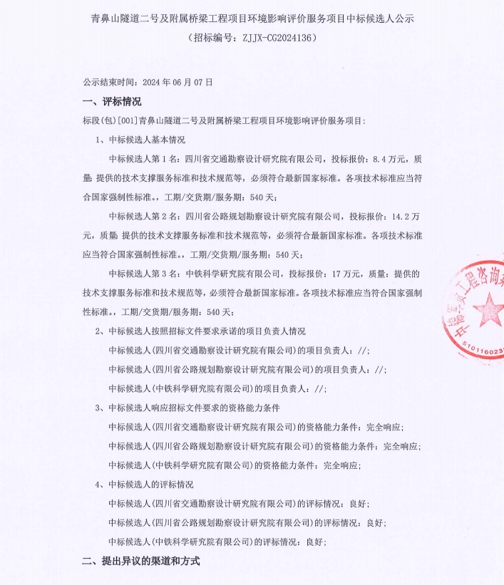 青鼻山隧道二號及附屬橋梁工程項目環(huán)境影響評價服務(wù)項目中標候選人公示