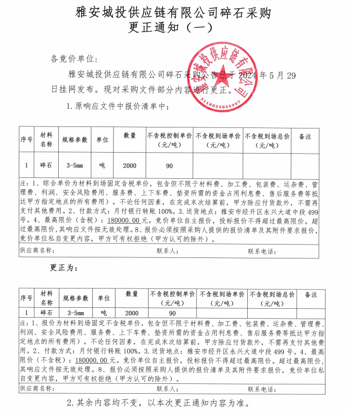 雅安城投供應鏈有限公司碎石采購更正通知(一)