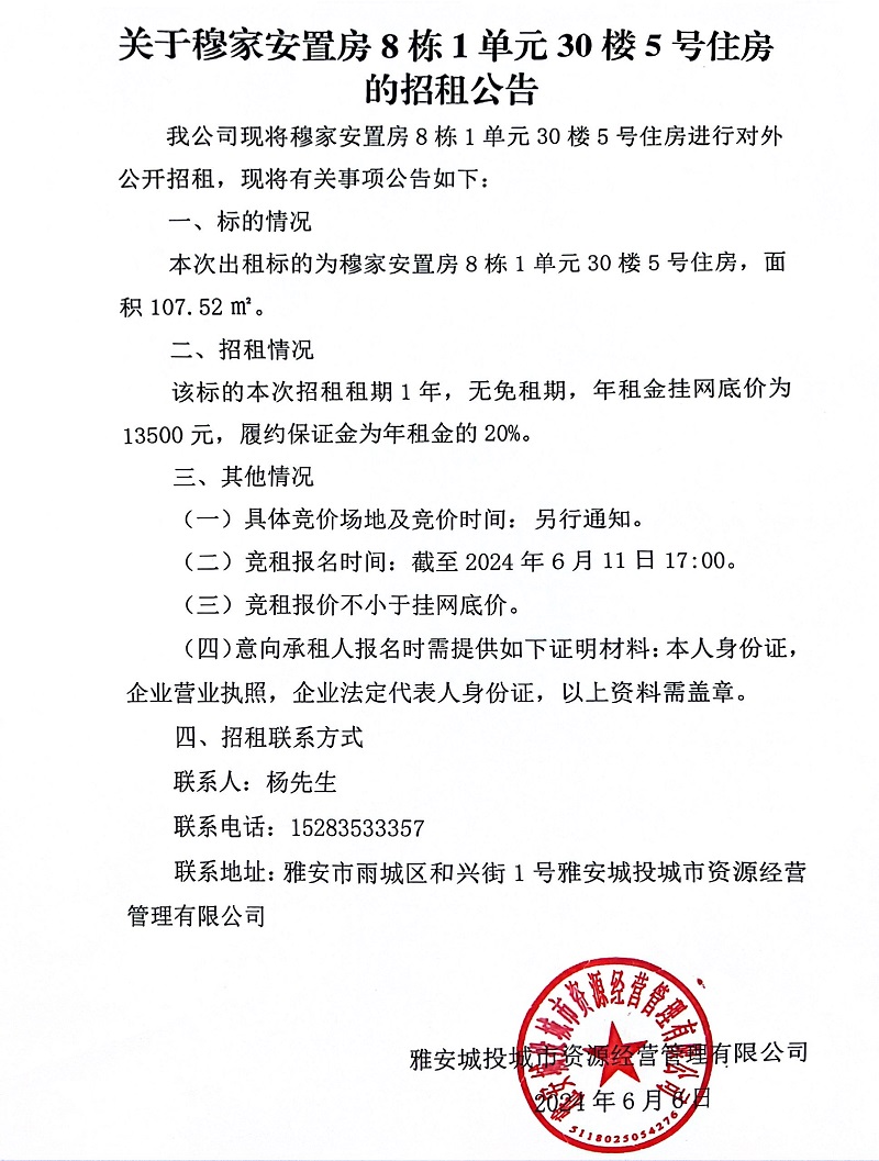 關(guān)于穆家安置房8棟1單元30樓5號住房的招租公告