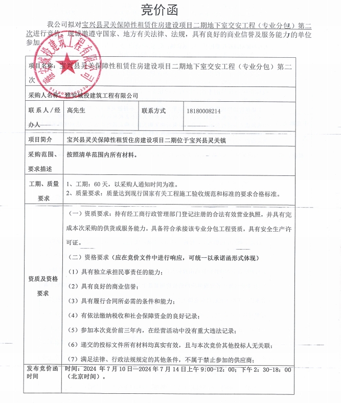 寶興縣靈關(guān)保障性租賃住房建設(shè)項(xiàng)目二期地下室交安工程(專業(yè)分包)第二次競價公告