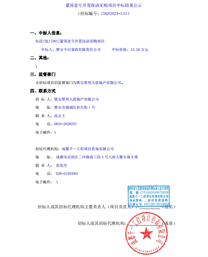 蒙頂壹號(hào)開(kāi)荒保潔采購(gòu)項(xiàng)目中標(biāo)結(jié)果公示
