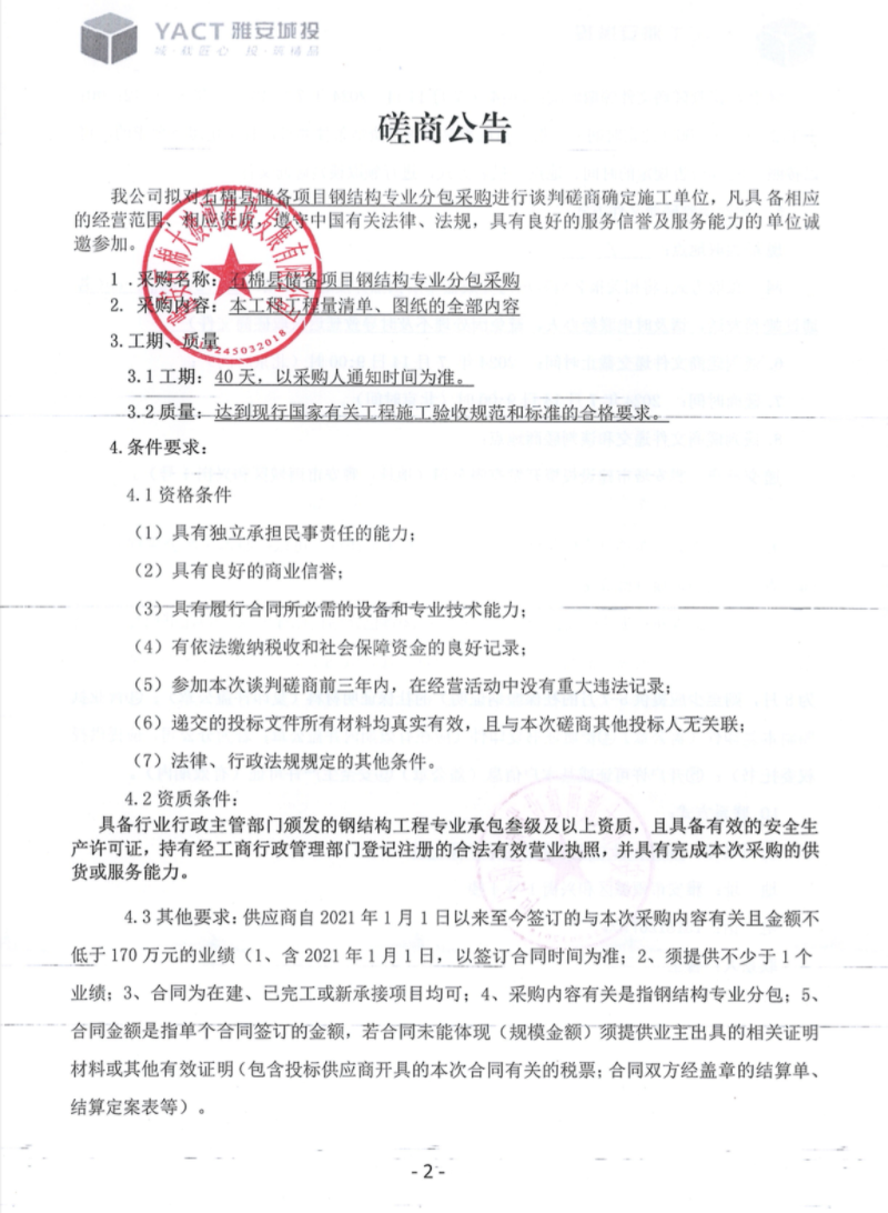 石棉縣儲備項(xiàng)目鋼結(jié)構(gòu)專業(yè)分包采購談判磋商公告