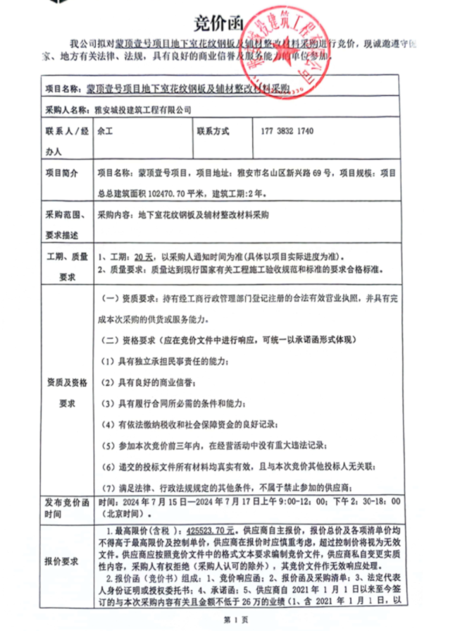 蒙頂壹號(hào)項(xiàng)目地下室花紋鋼板及輔材整改材料采購(gòu)競(jìng)價(jià)公告