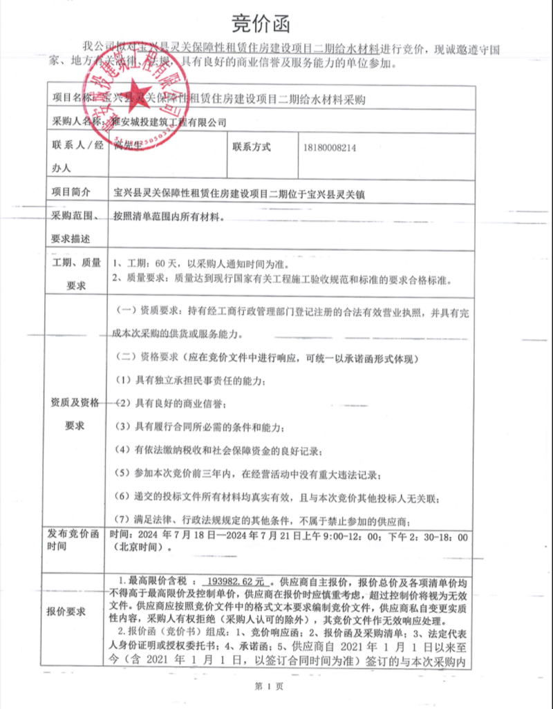 寶興縣靈關(guān)保障性租賃住房建設(shè)項(xiàng)目二期給水材料競(jìng)價(jià)公告