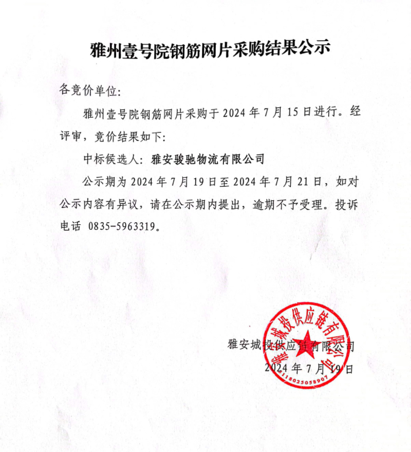 雅州壹號(hào)院鋼筋網(wǎng)片采購(gòu)結(jié)果公示