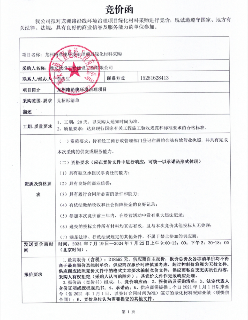 龍洲路沿線環(huán)境治理項目綠化材料采購競價公告