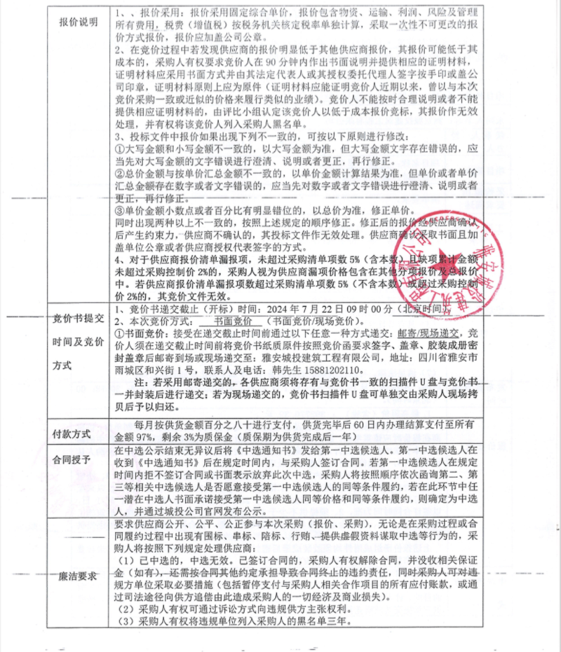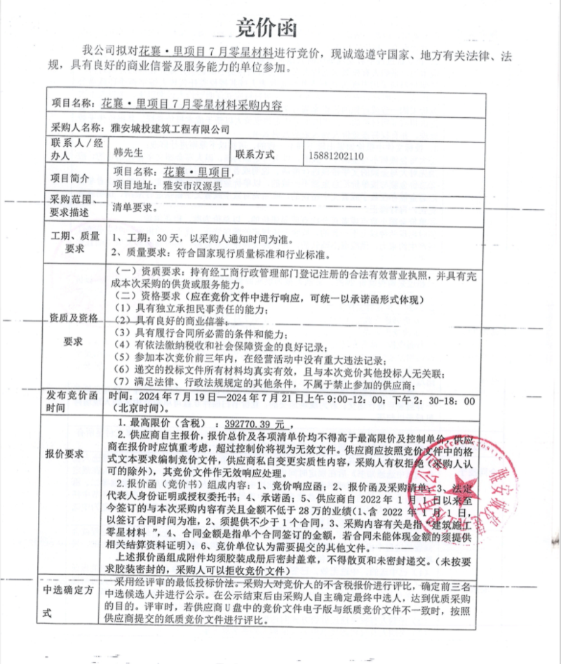 花襄·里項(xiàng)目7月零星材料采購競價(jià)公告