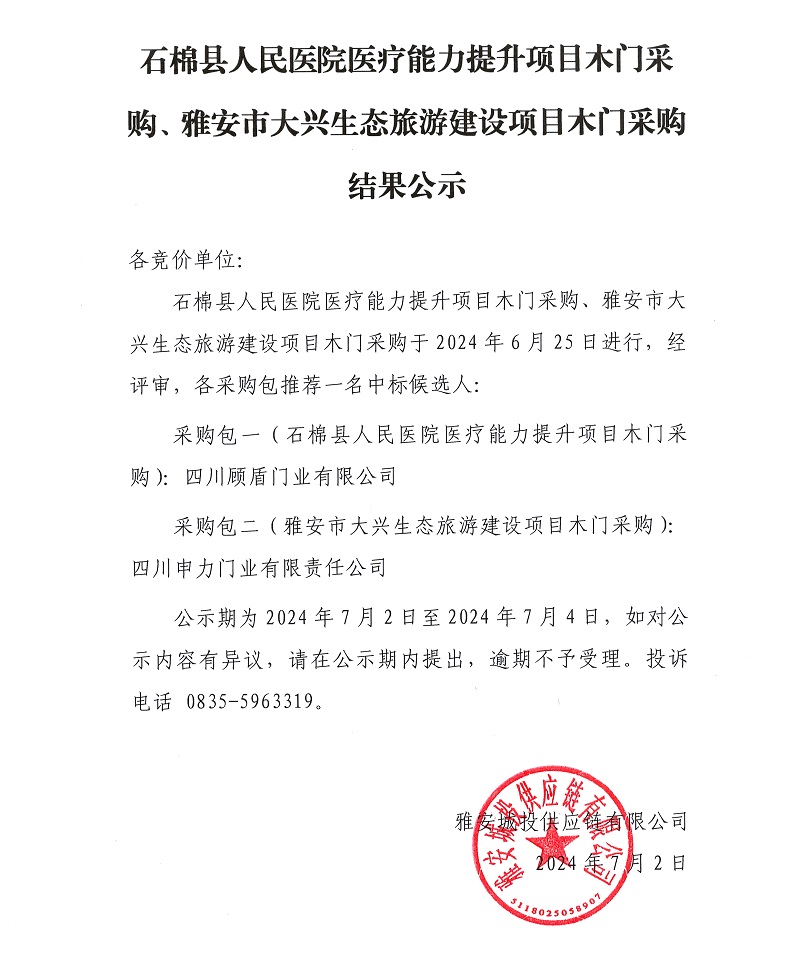 石棉縣人民醫(yī)院醫(yī)療能力提升項目木門采購、雅安市大興生態(tài)旅游建設項目木門采購結果公示