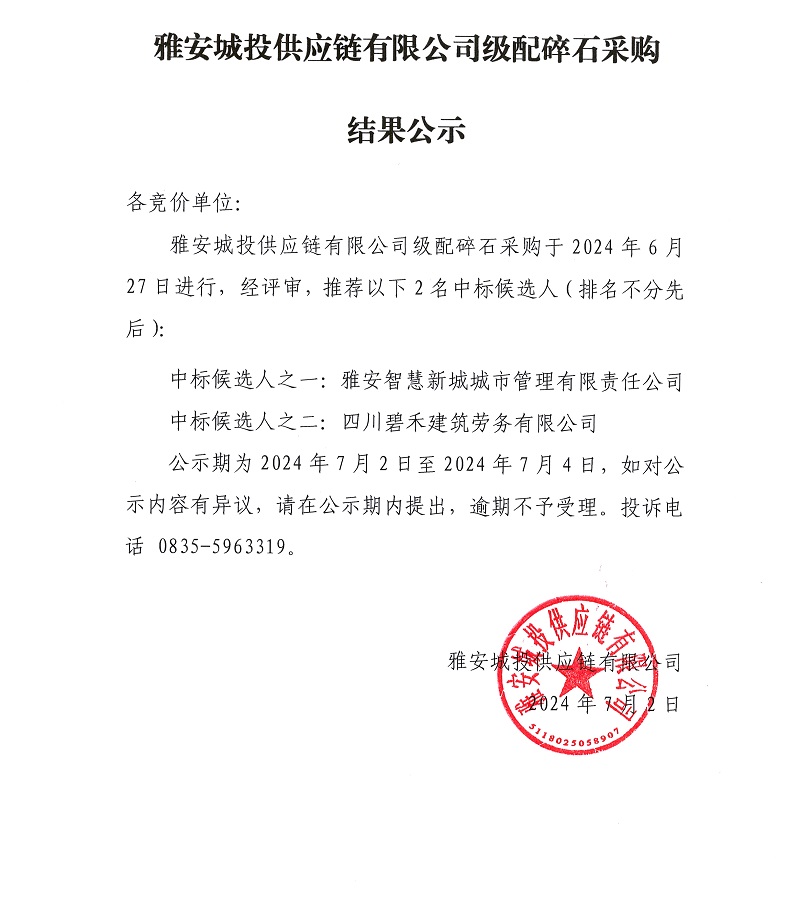 雅安城投供應(yīng)鏈有限公司級(jí)配碎石采購結(jié)果公示