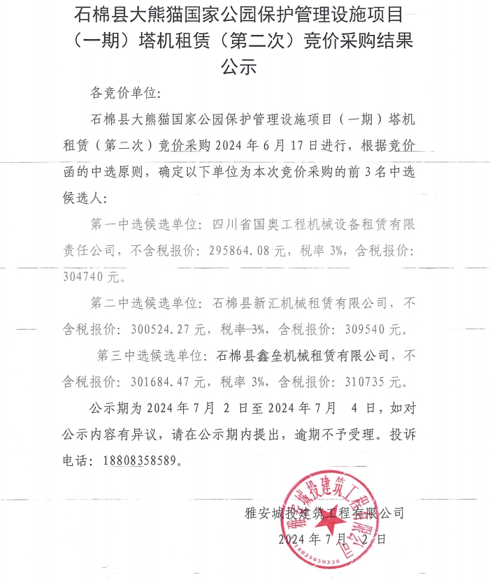 石棉縣大熊貓國家公園保護(hù)管理設(shè)施項目(一期)塔機(jī)租賃(第二次)競價采購結(jié)果公示