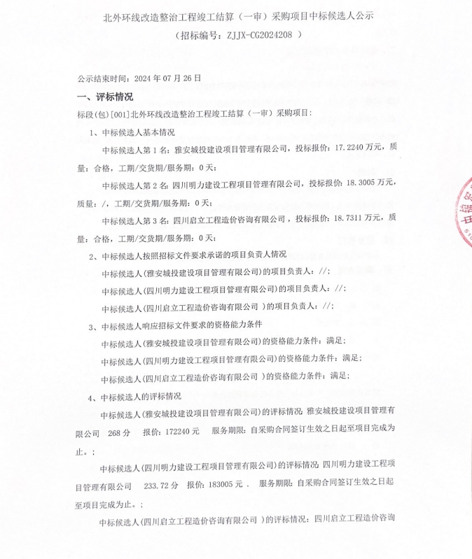 北外環(huán)線改造整治工程竣工結(jié)算(一審)采購項(xiàng)目中標(biāo)候選人公示