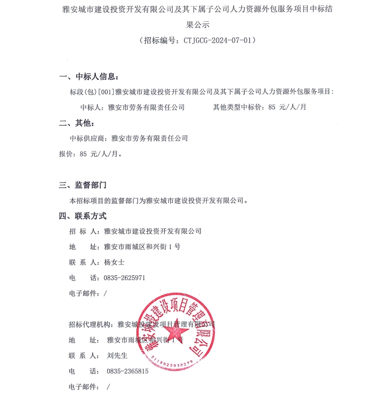 雅安城市建設(shè)投資開發(fā)有限公司及其下屬子公司人力資源外包服務(wù)項目中標結(jié)果公示