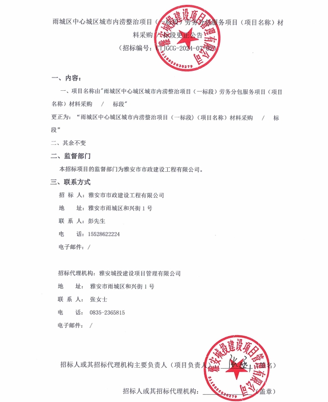 雨城區(qū)中心城區(qū)城市內(nèi)澇整治項(xiàng)目(一標(biāo)段)勞務(wù)分包服務(wù)項(xiàng)目(項(xiàng)目名稱)材料采購(gòu)/標(biāo)段更正公告