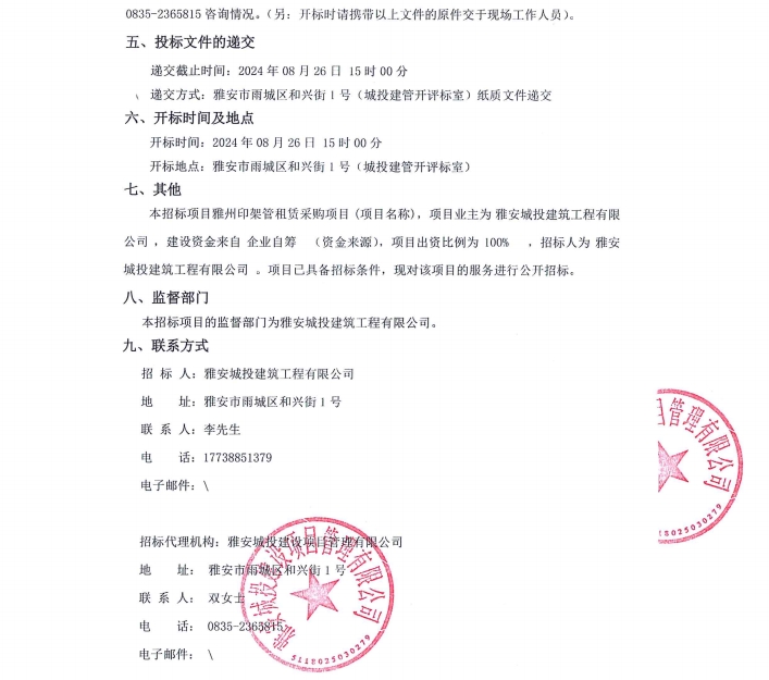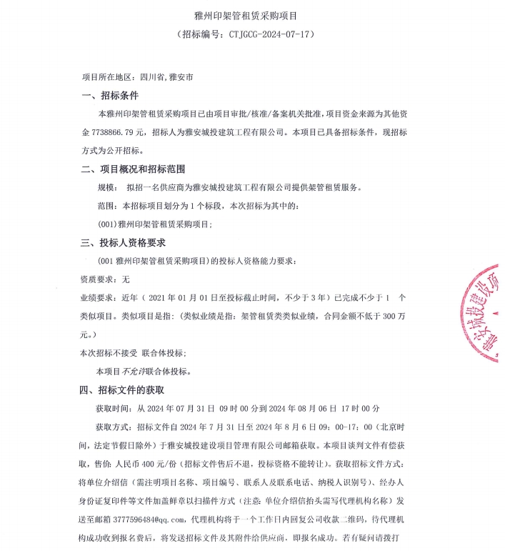 雅州印架管租賃采購項(xiàng)目公告