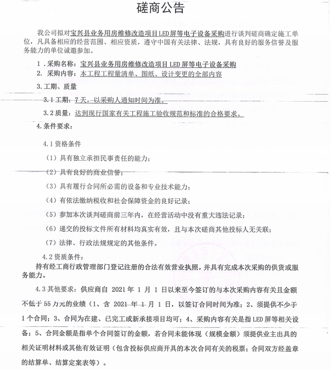 寶興縣業(yè)務(wù)用房維修改造項(xiàng)目LED屏等電子設(shè)備采購磋商公告
