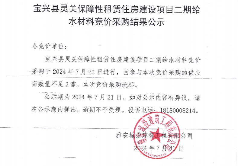 寶興縣靈關保障性租賃住房建設二期給水材料競價采購結果公示