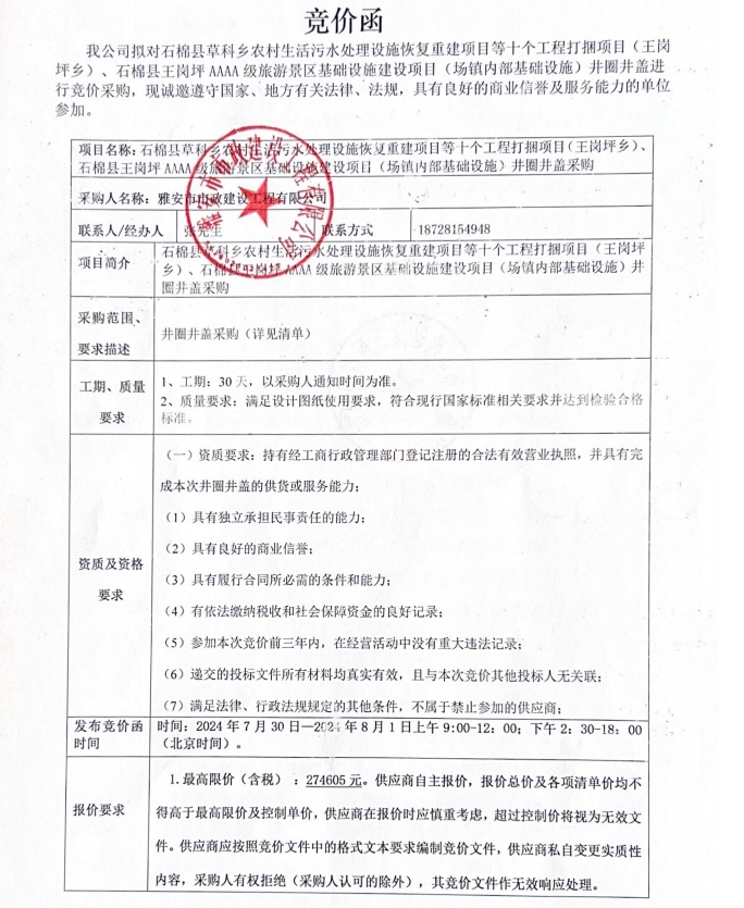 石棉縣草科鄉(xiāng)農(nóng)村生活污水處理設(shè)施恢復(fù)重建項目等十個工程打捆項目(王崗坪鄉(xiāng))、石棉縣王崗坪AAAA級旅游景區(qū)基礎(chǔ)設(shè)施建設(shè)項目(場鎮(zhèn)內(nèi)部基礎(chǔ)設(shè)施)井圈井蓋采購競價公告