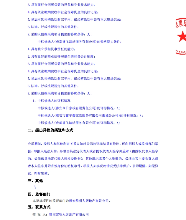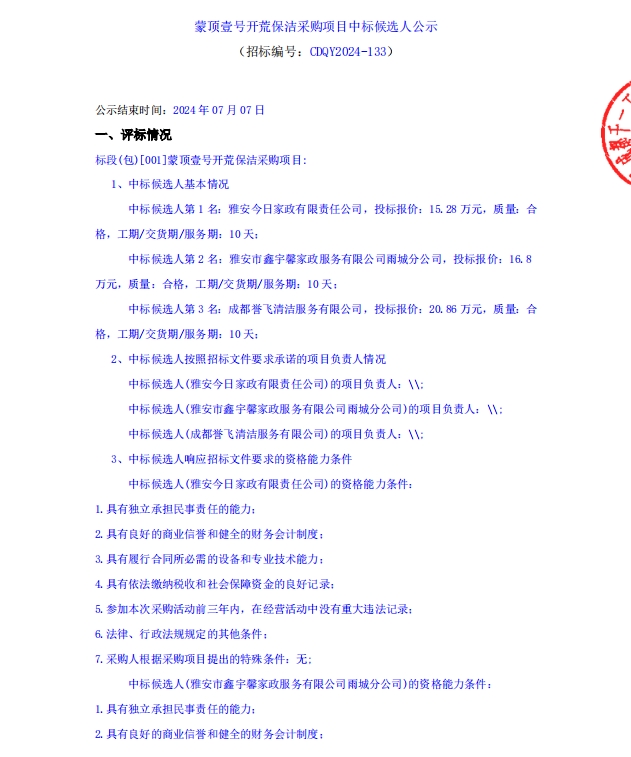 蒙頂壹號(hào)開荒保潔采購項(xiàng)目中標(biāo)候選人公示