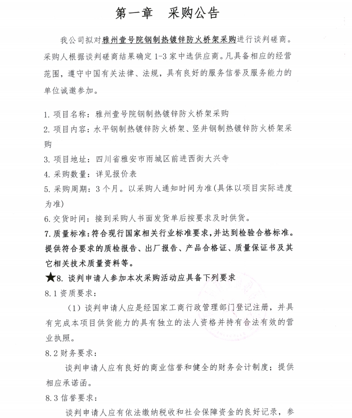 雅州壹號(hào)院鋼制熱鍍鋅防火橋架采購(gòu)公告