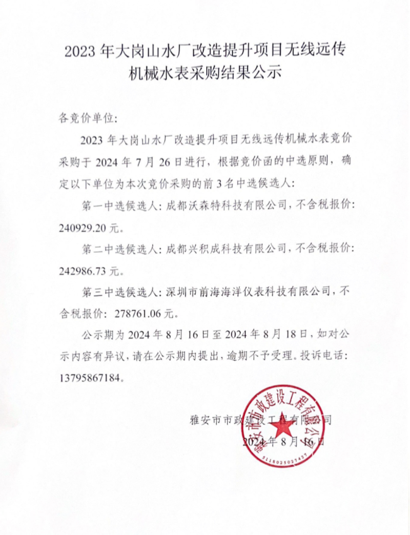 2023年大崗山水廠改造提升項目無線遠傳機械水表采購結(jié)果公示