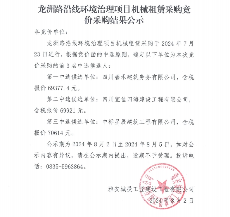 龍洲路沿線環(huán)境治理項目機械租賃采購競價采購結(jié)果公示