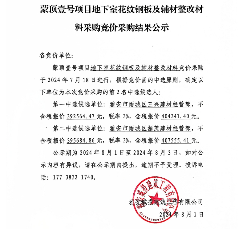 蒙頂壹號項(xiàng)目地下室花紋鋼板及輔材整改材料采購競價(jià)采購結(jié)果公示