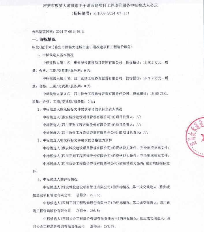 雅安市熊貓大道城市主干道改建項目工程造價服務(wù)中標候選人公示
