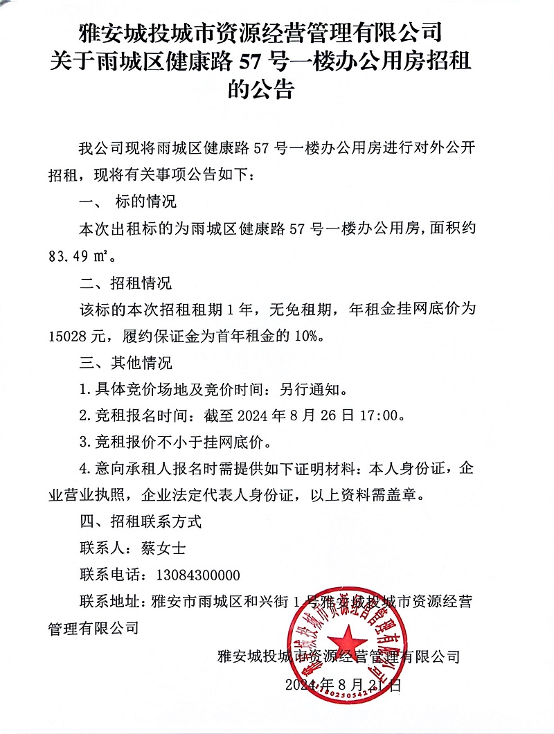 雅安城投城市資源經(jīng)營管理有限公司關于雨城區(qū)健康路75號一樓辦公用房招租的公告