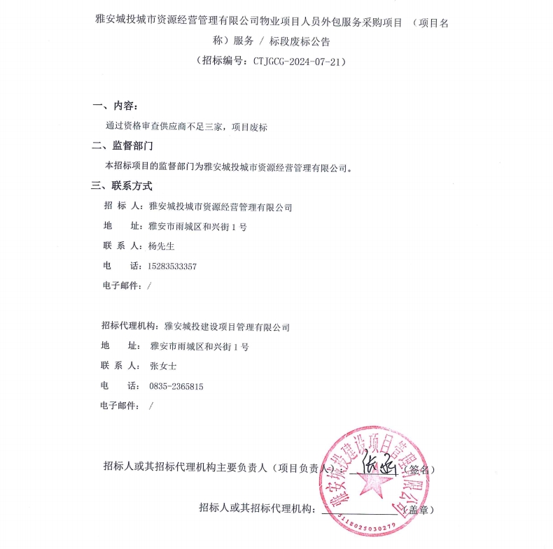 雅安城投城市資源經(jīng)營管理有限公司物業(yè)項目人員外包服務(wù)采購項目(項目名稱)服務(wù)/標段廢標公告