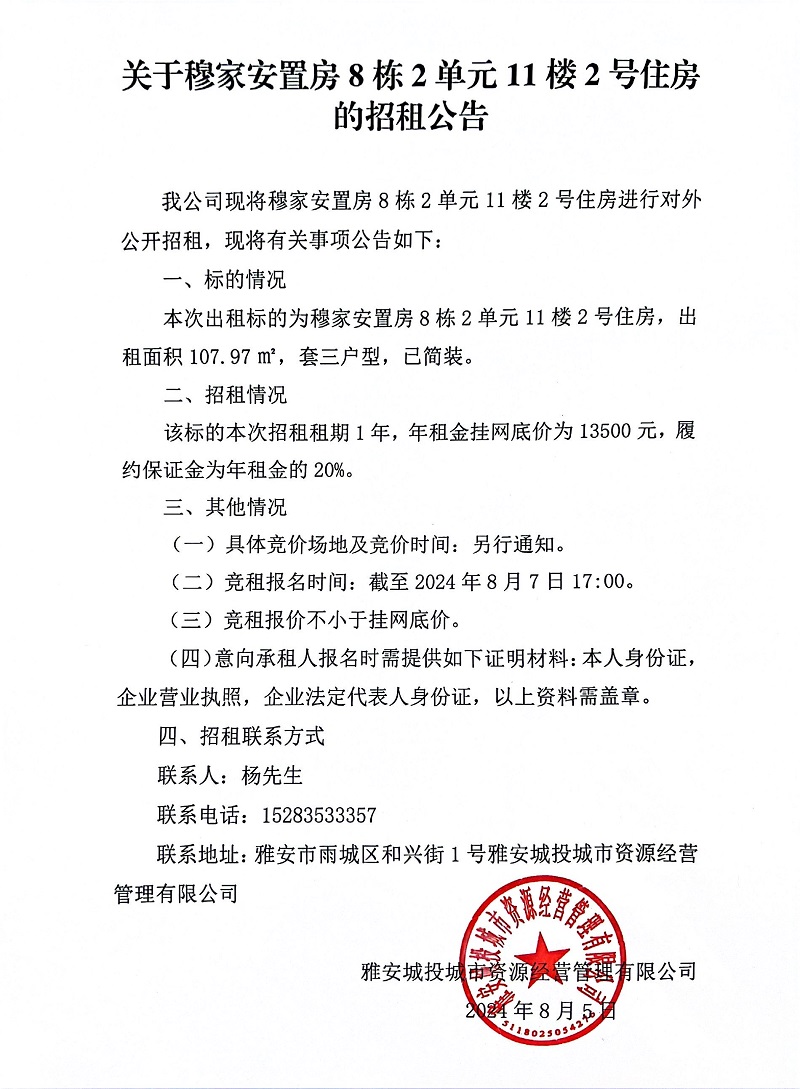 關(guān)于穆家安置房8棟2單元11樓2號住房的招租公告