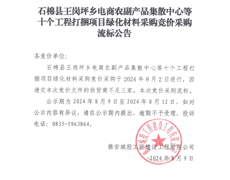 石棉縣王崗坪鄉(xiāng)電商農(nóng)副產(chǎn)品集散中心等十個(gè)工程打捆項(xiàng)目綠化材料采購競價(jià)采購流標(biāo)公告