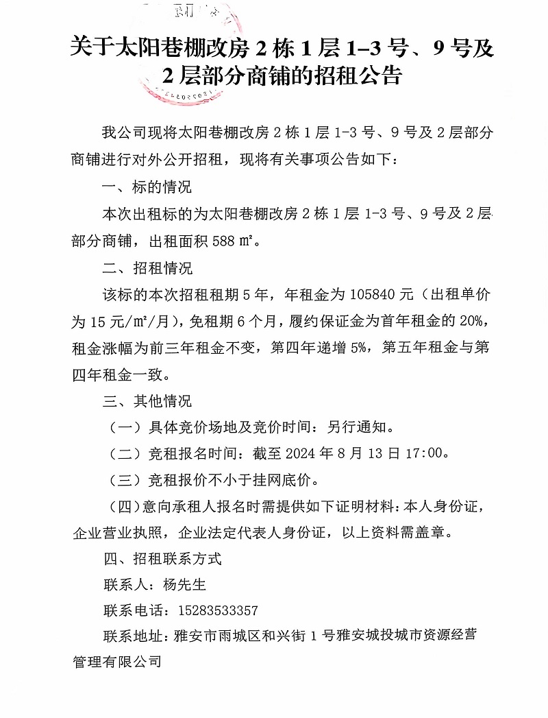 關(guān)于太陽巷棚改房2棟1層1-3號(hào)、9號(hào)及2層部分商鋪的招租公告