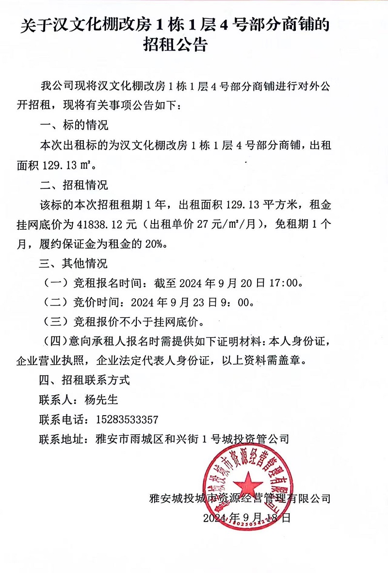 關于漢文化棚改房1棟1層4號部分商鋪的招租公告