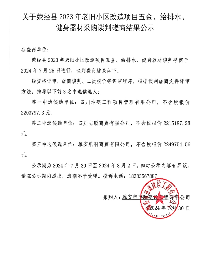 關(guān)于滎經(jīng)縣2023年老舊小區(qū)改造項目五金、給排水、健身器材采購談判磋商結(jié)果公示