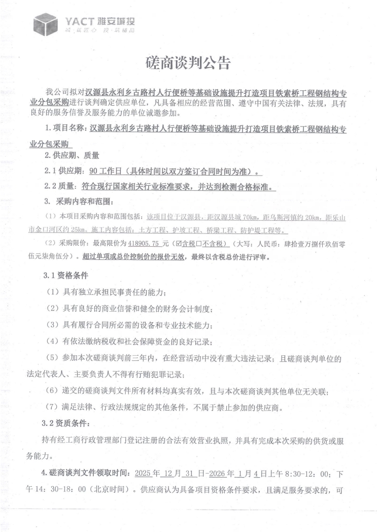 漢源縣永利古路村人行便橋等基礎(chǔ)設(shè)施提升打造項(xiàng)目鐵索橋工程鋼結(jié)構(gòu)專業(yè)分包采購磋商談判公告