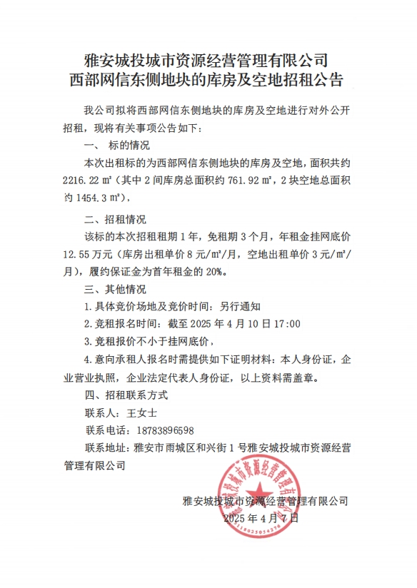 雅安城投城市資源經(jīng)營(yíng)管理有限公司西部網(wǎng)信東側(cè)地塊的庫(kù)房及空地招租公告