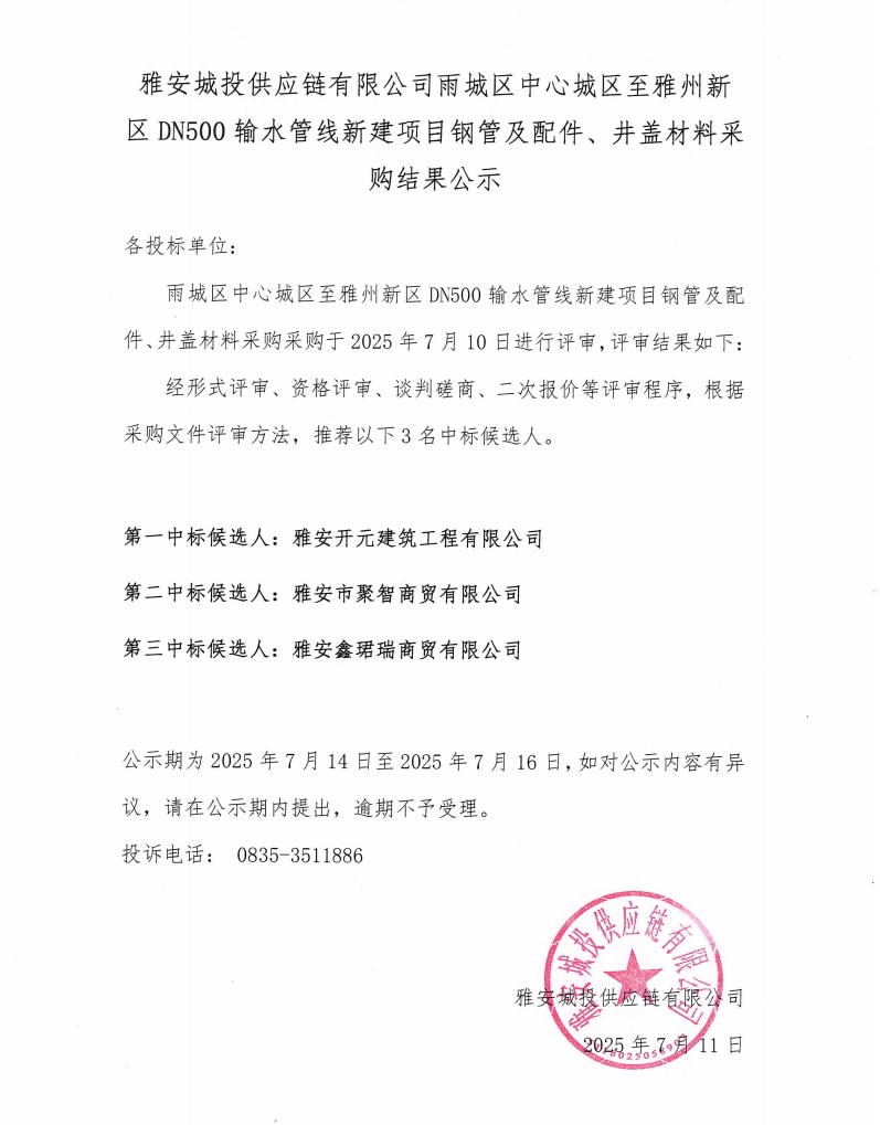 雅安城投供應鏈有限公司雨城區(qū)中心城區(qū)至雅州新區(qū)DN500輸水管線新建項目鋼管及配件、井蓋材料采購結(jié)果公示