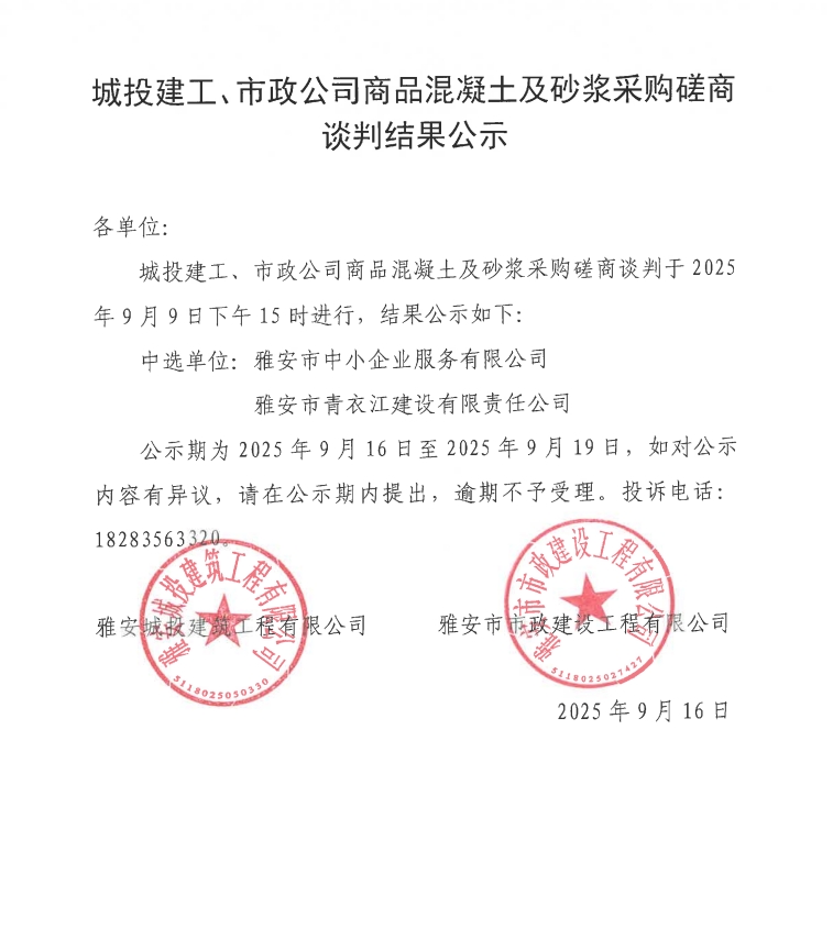 城投建工、市政公司商品混凝土及砂漿采購磋商談判結(jié)果公示