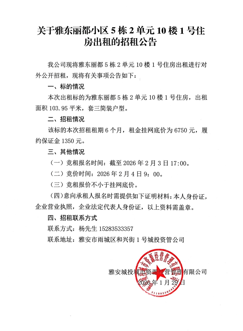關(guān)于雅東麗都小區(qū)5棟2單元10樓1號(hào)住房出租的招租公告