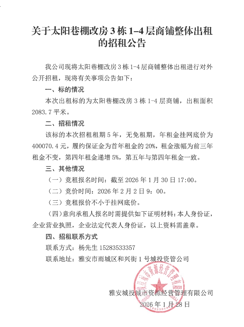 關于太陽巷棚改房3棟1-4層商鋪整體出租的招租公告