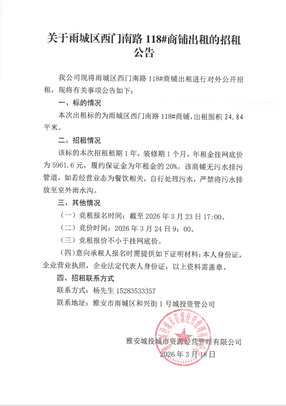 關(guān)于雨城區(qū)西門南路118#商鋪出租的招租公告