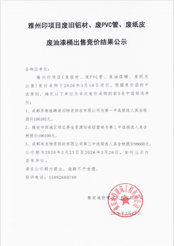 雅州印項目廢舊鋁材、廢PVC管、廢紙皮、廢油漆桶出售競價結(jié)果公示