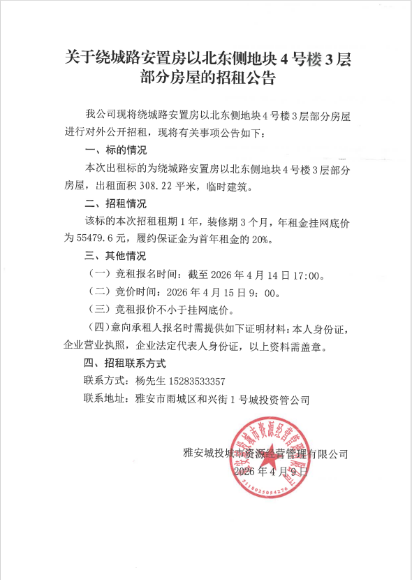 關(guān)于繞城路安置房以北東側(cè)地塊4號樓3層部分房屋的招租公告