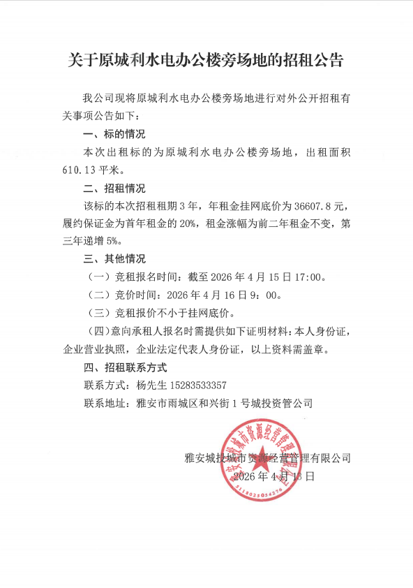 關(guān)于原城利水電辦公樓旁場(chǎng)地的招租公告