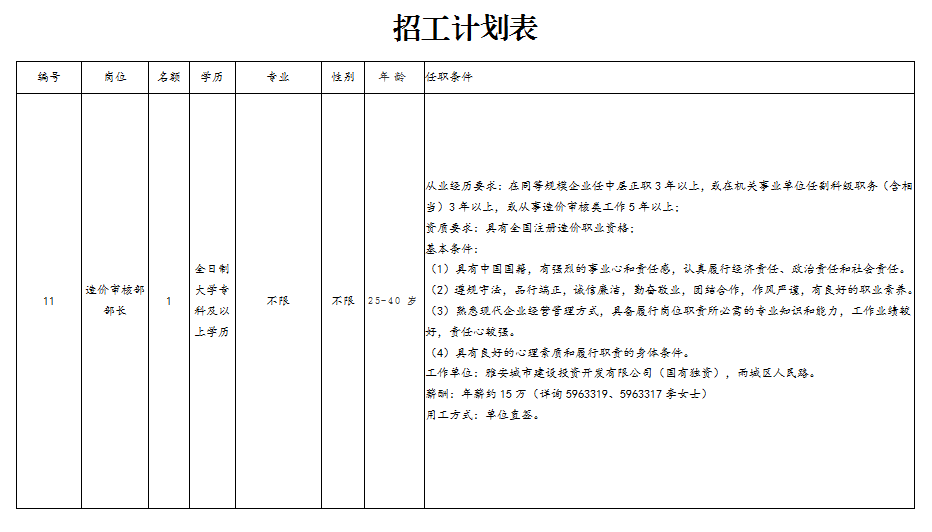雅安城市建設(shè)投資開發(fā)有限公司造價(jià)審核部部長(zhǎng)1名。
