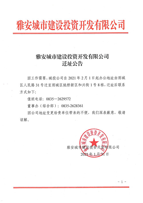 雅安城市建設(shè)投資開發(fā)有限公司遷址公告