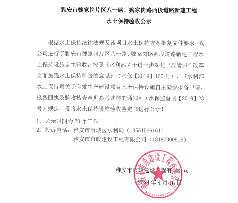 雅安市魏家崗片區(qū)八一路、魏家崗路西段道路新建工程水土保持驗(yàn)收公示