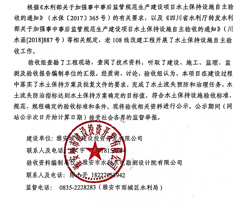 關(guān)于老108線改建工程水土保持設(shè)施自主驗收情況的公示