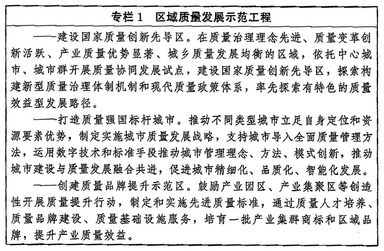 (九)打造區(qū)域質(zhì)量發(fā)展新優(yōu)勢。加強(qiáng)質(zhì)量政策引導(dǎo),推動區(qū)域質(zhì)量發(fā)展與生產(chǎn)力布局、區(qū)位優(yōu)勢、環(huán)境承載能力及社會發(fā)展需求對接融合。推動?xùn)|部地區(qū)發(fā)揮質(zhì)量變革創(chuàng)新的引領(lǐng)帶動作用,增強(qiáng)質(zhì)量競爭新優(yōu)勢,實(shí)現(xiàn)整體質(zhì)量提升。引導(dǎo)中西部地區(qū)因地制宜發(fā)展特色產(chǎn)業(yè),促進(jìn)區(qū)域內(nèi)支柱產(chǎn)業(yè)質(zhì)量升級,培育形成質(zhì)量發(fā)展比較優(yōu)勢。推動?xùn)|北地區(qū)優(yōu)化質(zhì)量發(fā)展環(huán)境,加快新舊動能轉(zhuǎn)換,促進(jìn)產(chǎn)業(yè)改造升級和質(zhì)量振興。健全區(qū)域質(zhì)量合作互助機(jī)制,推動區(qū)域質(zhì)量協(xié)同發(fā)展。深化質(zhì)量強(qiáng)省建設(shè),推動質(zhì)量強(qiáng)市、質(zhì)量強(qiáng)業(yè)向縱深發(fā)展,打造質(zhì)量強(qiáng)國建設(shè)標(biāo)桿。